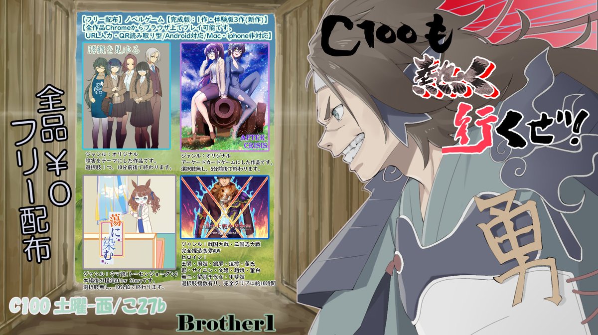 #C100 のお品書きになります。 ブースは【8月13日(土)-西/こ27b】です。 大戦学園/オリジナルのゲーム及びグッズを配布予定です。 大戦学園のゲーム本編及び大戦学園に関するグッズは今回の配布分で終了となり、次回からは出品予定はありません。 望月千代女(ちよめ)エンディングもありますので何卒