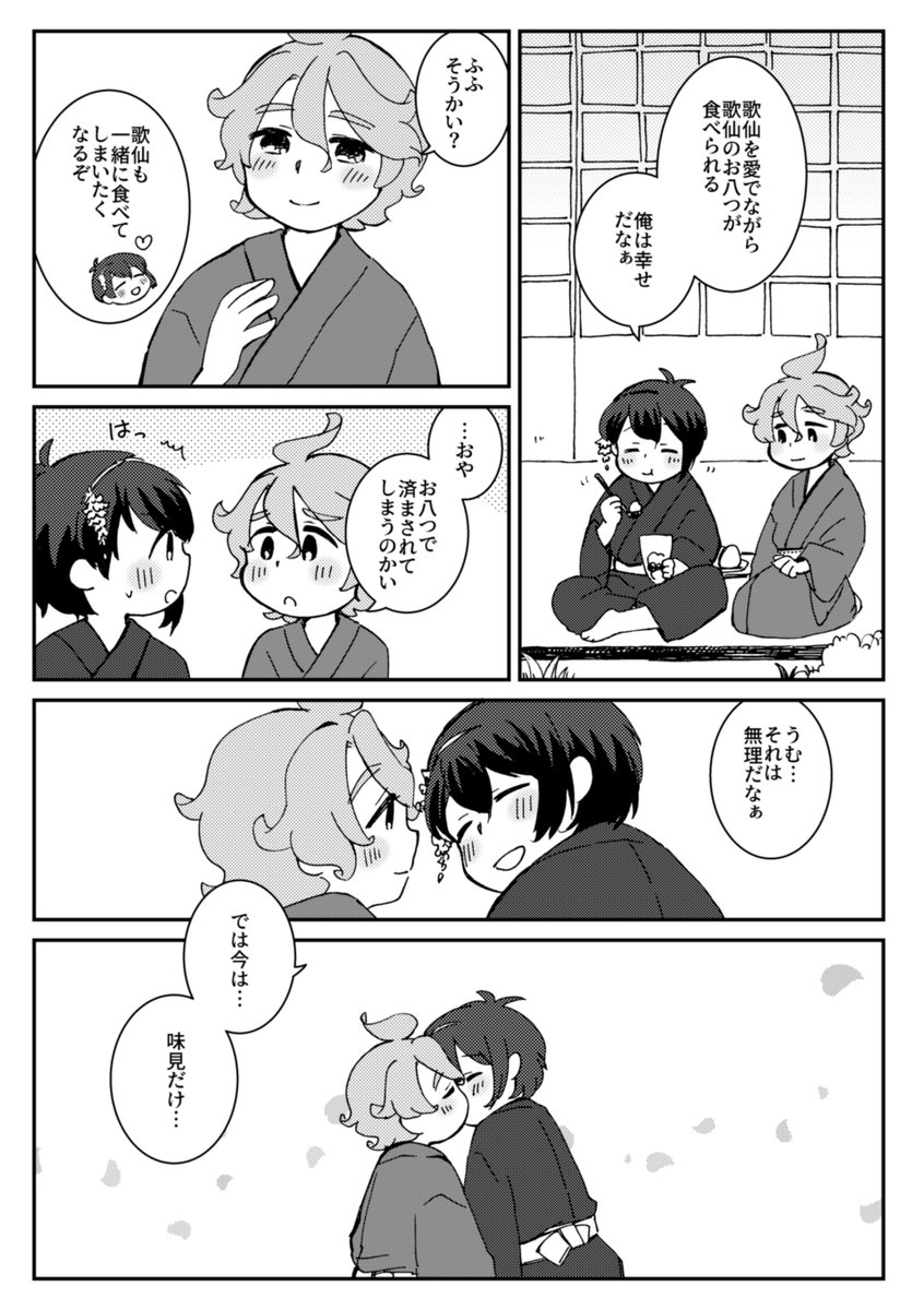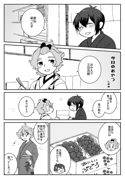 16 30 みやびまつり5(@myb180318)開催おめでとうございました~!! 主催の芦原さんありがとうございます。そしてお疲れ様でした。 当日新刊発行で貰える三歌本に寄稿させて頂いた漫画です。軽装と四季のテーマで秋の三歌を描かせて頂きました🍇三歌はいいぞ~💙💜 21/11/28 17:41