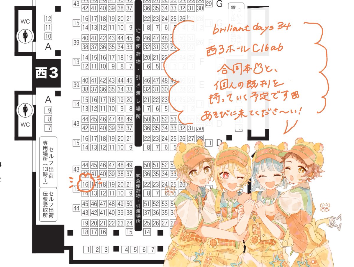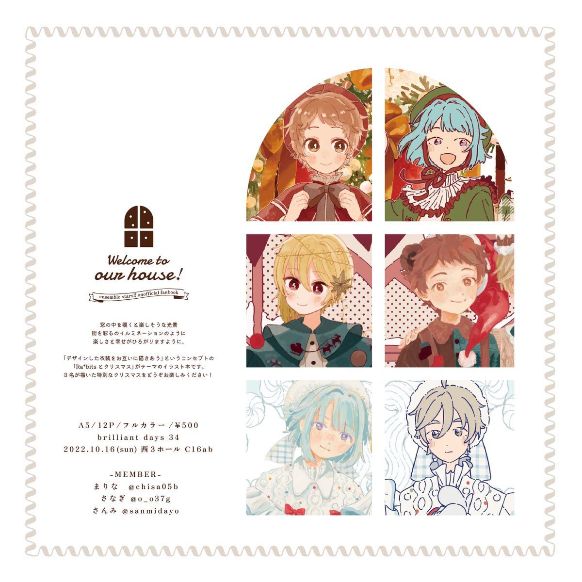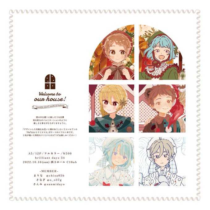 10/16🌼brilliant days34 西3ホール C16ab スペース頂いています🙇♀️ 今回は合同スペースです! まりなさん、さなぎさんと私の3人で 「Ra*bitsとクリスマス」をテーマに、オリジナル衣装を描きあいっこしました🎄 他にも個人の既刊を持っていく予定です。是非遊びにいらしてください🥳