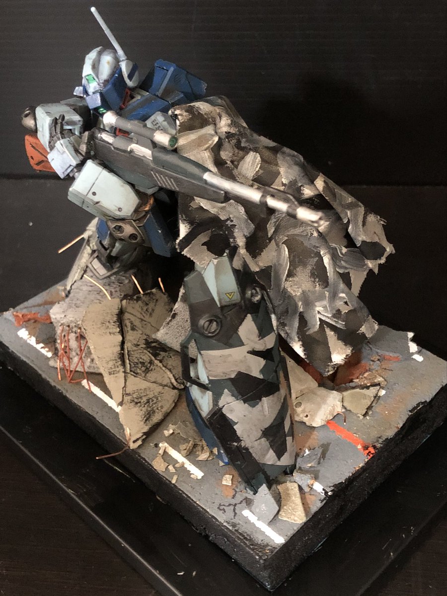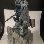 完成! これめっちゃかっこいいのでは? (自画自賛) #ガンプラ #ミニジオラマ #グフカスタム #08小隊 #ガンプラの画像を貼るとRTされると聞いて なおアニメに合わせたパースのため見上げアングル以外は残念