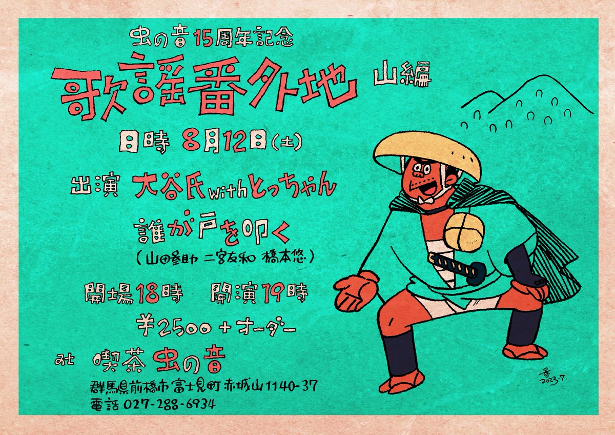 ♦️♦️♦️8/12(土)赤城山の喫茶・虫の音で 大谷氏withとっちゃんと誰が戸を叩くでやります。お近くの方ぜひ!