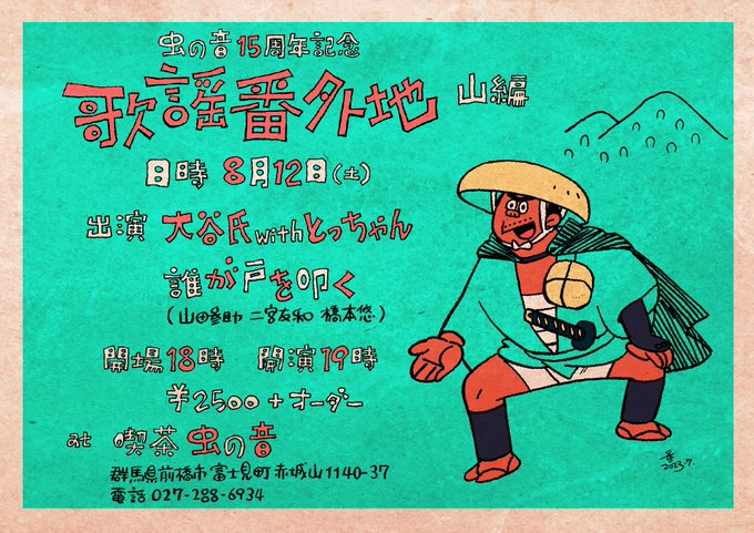 33 74 ♦️♦️♦️8/12(土)赤城山の喫茶・虫の音で 大谷氏withとっちゃんと誰が戸を叩くでやります。お近くの方ぜひ! 23/07/25 12:35