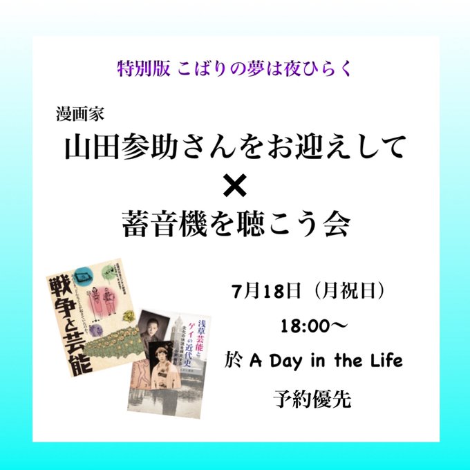 5 19 本日はこれから新宿二丁目でこないだ表紙を描かせていただいた「戦争と芸能」の著者のひとり、小針侑起氏と蓄音機を聴く会に参ります。小針氏は戦前からの芸能に詳しいのでいつも色々聞いてしまう。 22/07/18 16:12