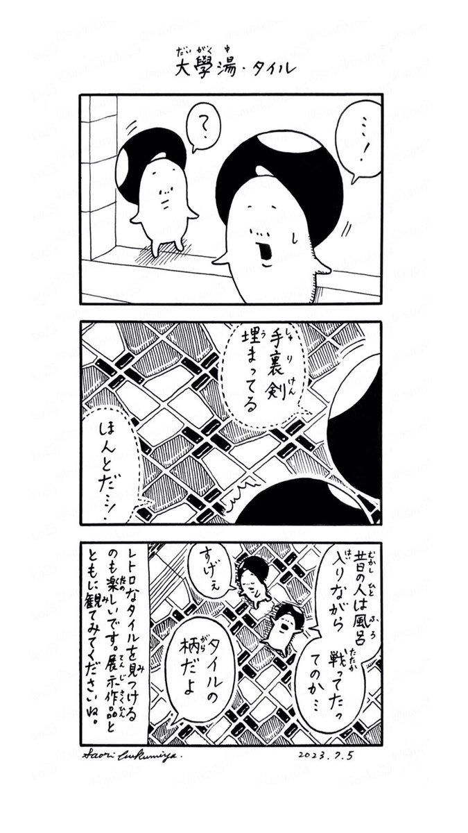 大學湯・タイル ただいま参加中『Blue.展』 きのこは開催場所 大學湯の大浴場で何かを見つけたようです @daigakuyu07 #きのこ #漫画が読めるハッシュタグ twitter.com/saorikinoko25/…