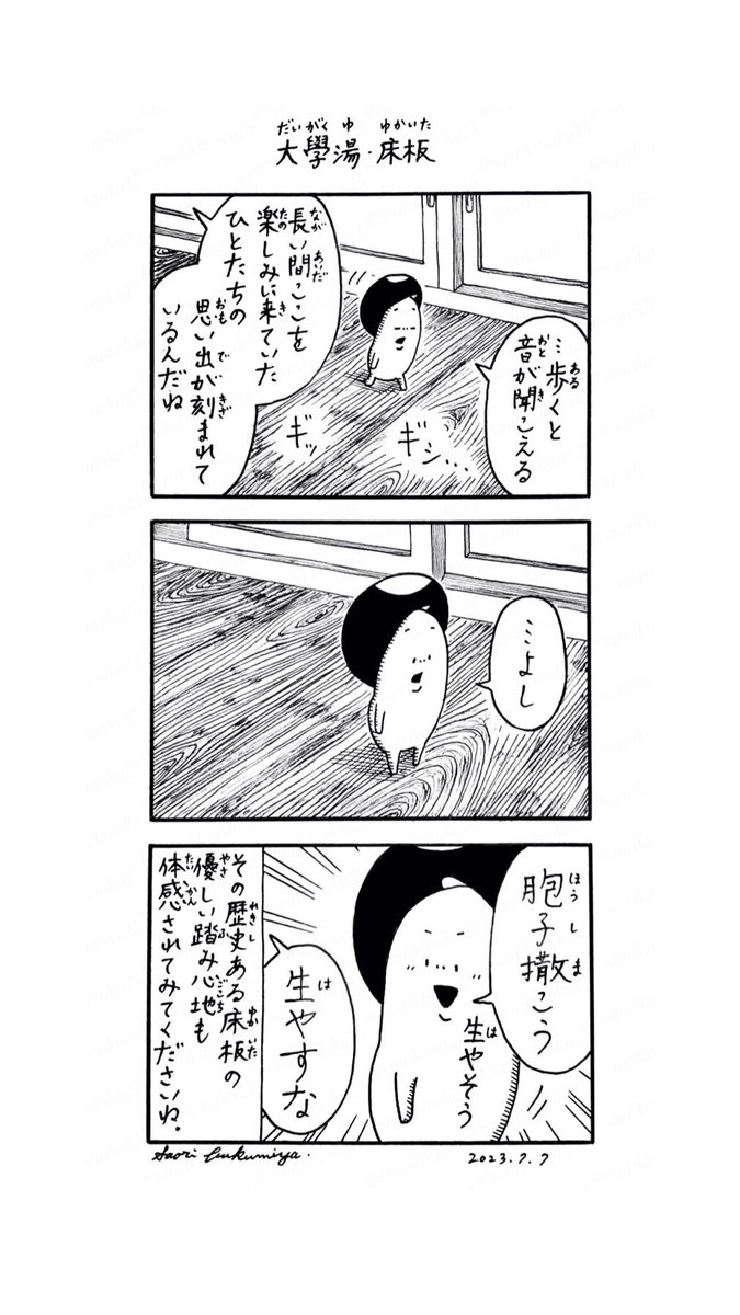 大學湯・床板 ただいま参加中『Blue.展』 きのこは開催場所 大學湯の床を歩くと何かに気づいたようです @daigakuyu07 #きのこ #漫画が読めるハッシュタグ twitter.com/saorikinoko25/…