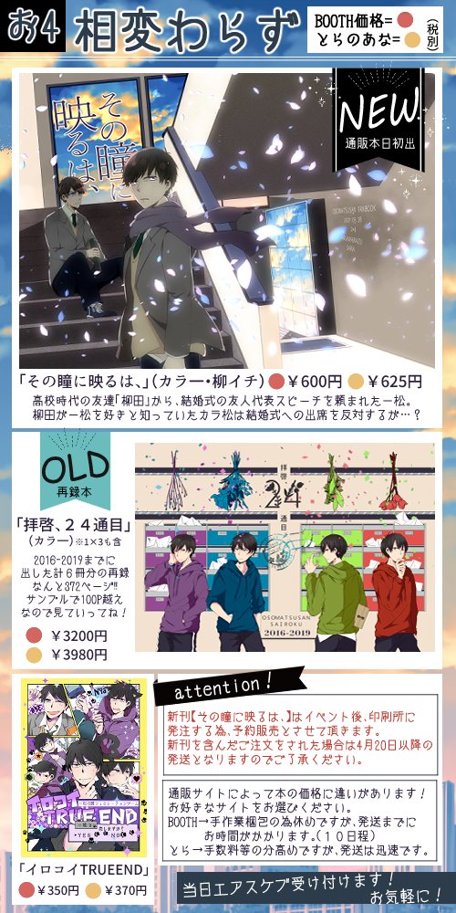 ギリギリまで頑張りましたが新刊ちょっと難しそうなので今回は既刊のみで参加失礼します~!既刊は残りわずかのもの多いのでよかったら見て行ってください! Twitterでなんか落書きするかもです! #最初からずっと一番近いトコ