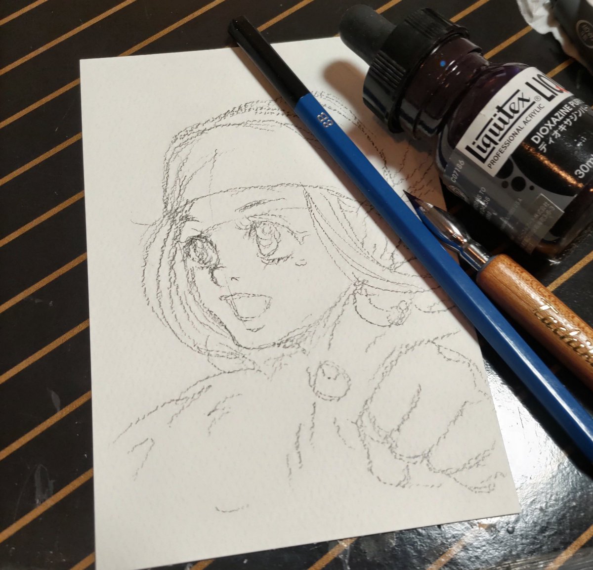 #金カムアナログイラスト部 アナログ部メンバー様とスケブ交換企画で描いたイラストです!4枚のうちの2枚。スケブなので(私の若い頃の概念)ラフな線と塗りでーす!墨系顔彩多めなのでおとなし目の色です😌写真撮るの下手くそで暗いですが😂