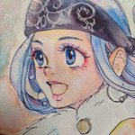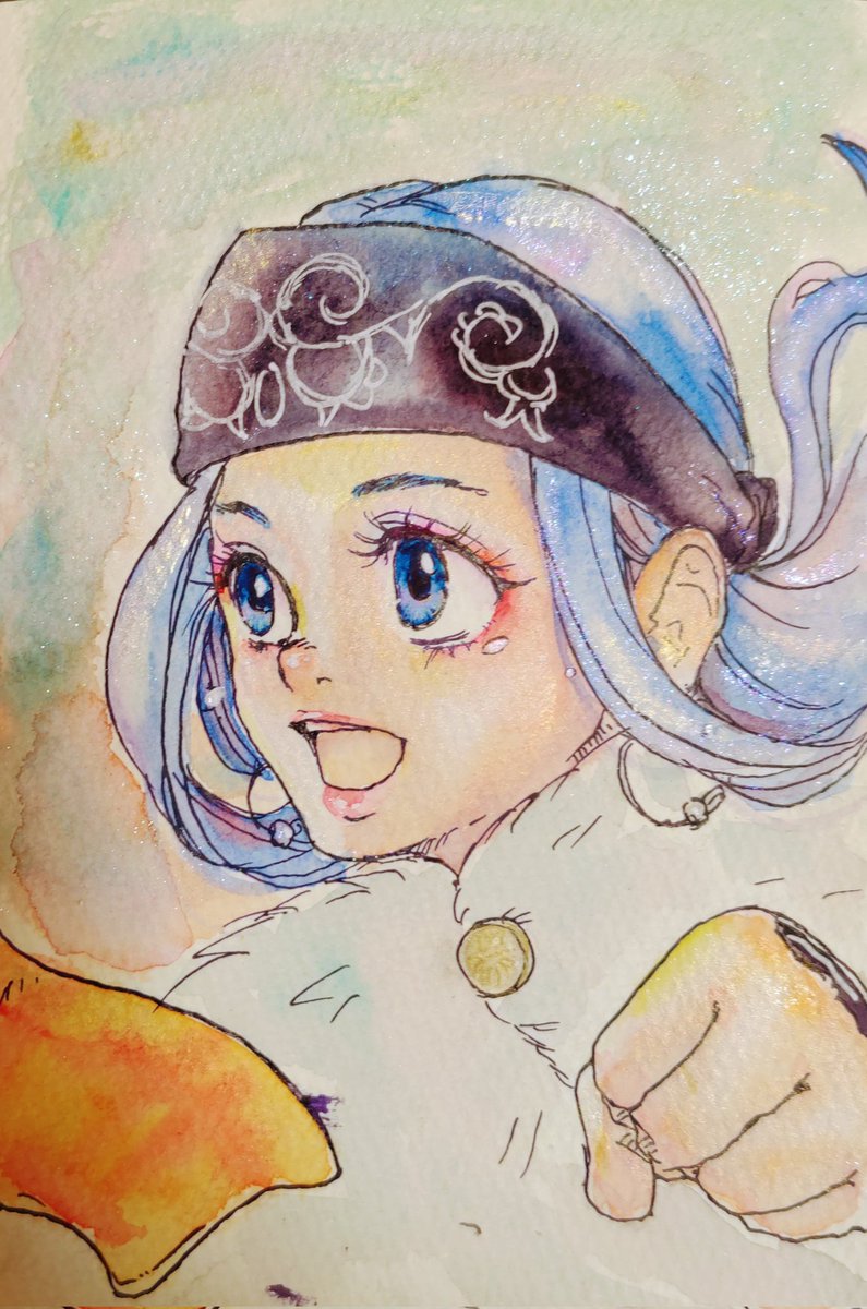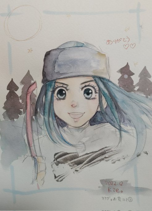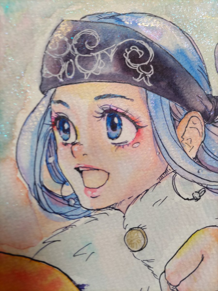 #金カムアナログイラスト部 アシリパさん。下書きに時間かかってないので一時間以内ですかね。今回はざっくり線画書いて古のつけペン引っ張り出してペン入れしてみました😆耐水インクで。透明水彩中心にホワイトマーカーとキラキラ絵の具乗せ。ところでアナログの写真写すコツをどなたか😭色が変わる😥