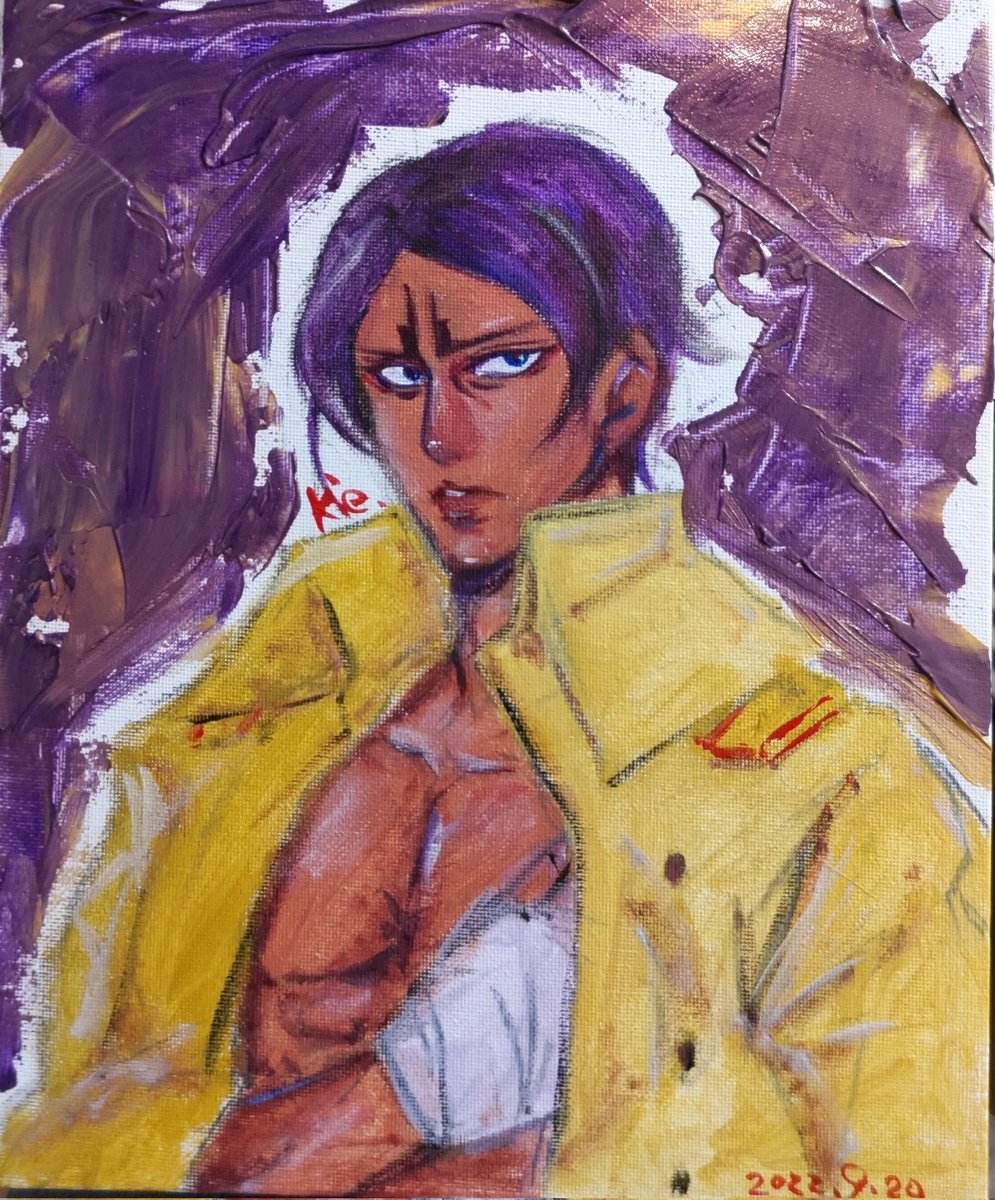 #金カムアナログイラスト部 最後のお題!自由!! 初めてキャンバスってものにアクリルで😂やり方わからん!!(笑)約一時間ですかね。顔が上手く描けない😭ブヒぃ😭😭多分ここから重ねて直してくのよね??お時間なくてここまでですが🙏💦素敵な企画に参加させていただき本当にありがとうでした🥲