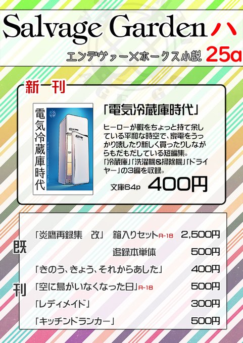 12 28 5/4新刊サンプルUPしました。 「電気冷蔵庫時代」文庫64p/400円 ヒ暇世な平和時空の未来で家電をクラッシュしたり買い換えたりしつつ、なんかもだもだしてる炎ホです。 【MHA】電気冷蔵庫時代【サンプル】 | 丹羽ましら #pixiv pixiv.net/novel/show.php… 23/04/29 10:46