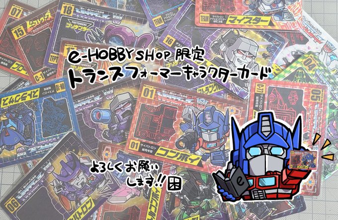 e-HOBBYさんにて販売中のトランスフォーマーキャラクターカードのデフォルメイラストに参加させてもらっています。 現在第4弾まで販売中です。現在第5弾予約中!よろしくお願いします。 e-hobby.co.jp/html/page71.ht… #トランスフォーマー #Transformers #TFカード