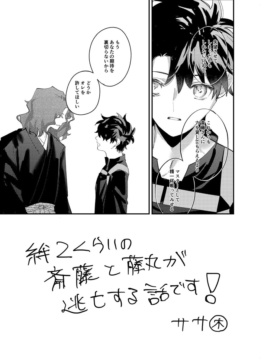21 106 絆2の斎藤さんと藤丸が逃亡する話です!サンプル! 一ぐだ♂ #はじぐだ男逃亡アンソロ (@hgdatto ) 23/04/09 17:11