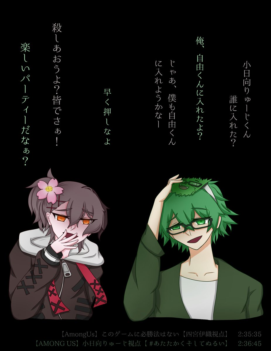2 26 #あたたかくそしてぬるい ずっと面白かったしスキン色々でかわいかったし特殊役職とかもろもろ新しくて新鮮だった #ごみやーと #夕悠アート #高生紳士 #ひなたの小日向家 21/10/12 04:16