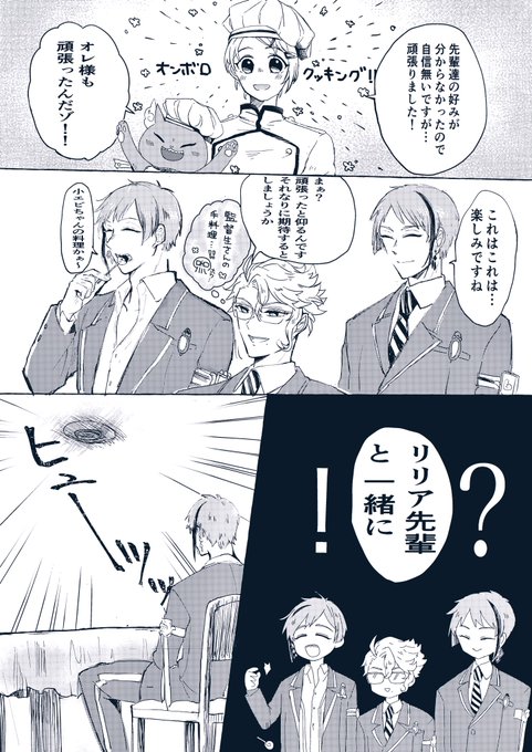 64 696 監+オク 料理的なあれそれ (ひとつまみ程度のアズ監を入れた…) ※監顔あります トーンのモアレごめんね… #twstプラス 21/05/08 19:09