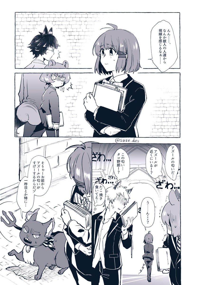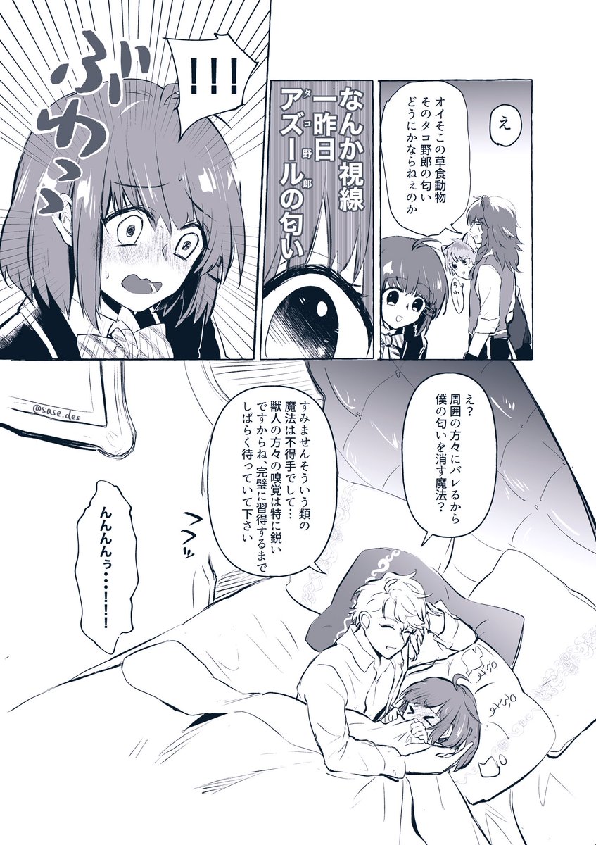 アズ監♀ ※監顔ある喋る/ほぼほぼアズ出ない ※致した表現ほんのり 🐙「いやぁ獣人の方々は嗅覚がイヌ並み…いえ、あれほど鋭いと虫除けと宣伝に丁度いいですよねぇ…」 #twstプラス