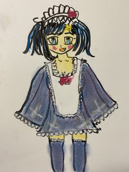 春霞みぃなちゃん初描き! ネコ耳✖️メイド✖️おっぱい属性たまらんのよ!😳 30分くらいで筆ペンとパステル(DAISO製品)使って描いたんだ!🥰 #春霞みぃな #みぃらすと