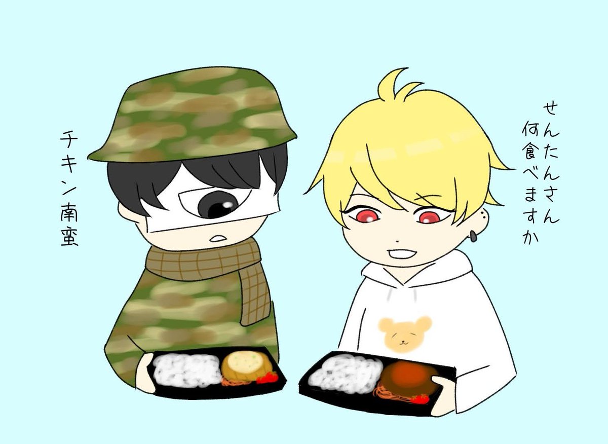 せんたんとあるまさんが大量にお弁当を買ってきて二人で食べるだけの実写動画を撮る、という謎の夢を見たのですがかわいかったので描いときました😌 なんか三日分くらいの大量のお弁当買ってた #せんたんあーと #あるまぁーと