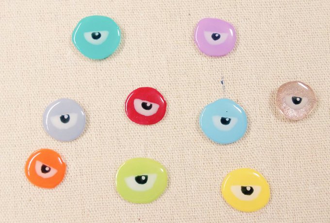 特に意味は無いけど、いろんな色の一つ目の何かを量産しています。 並べてみたら目がいっぱいある妖怪みたいになりました。 #せんたんあーと