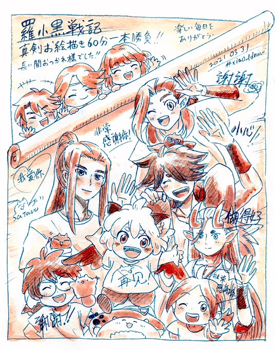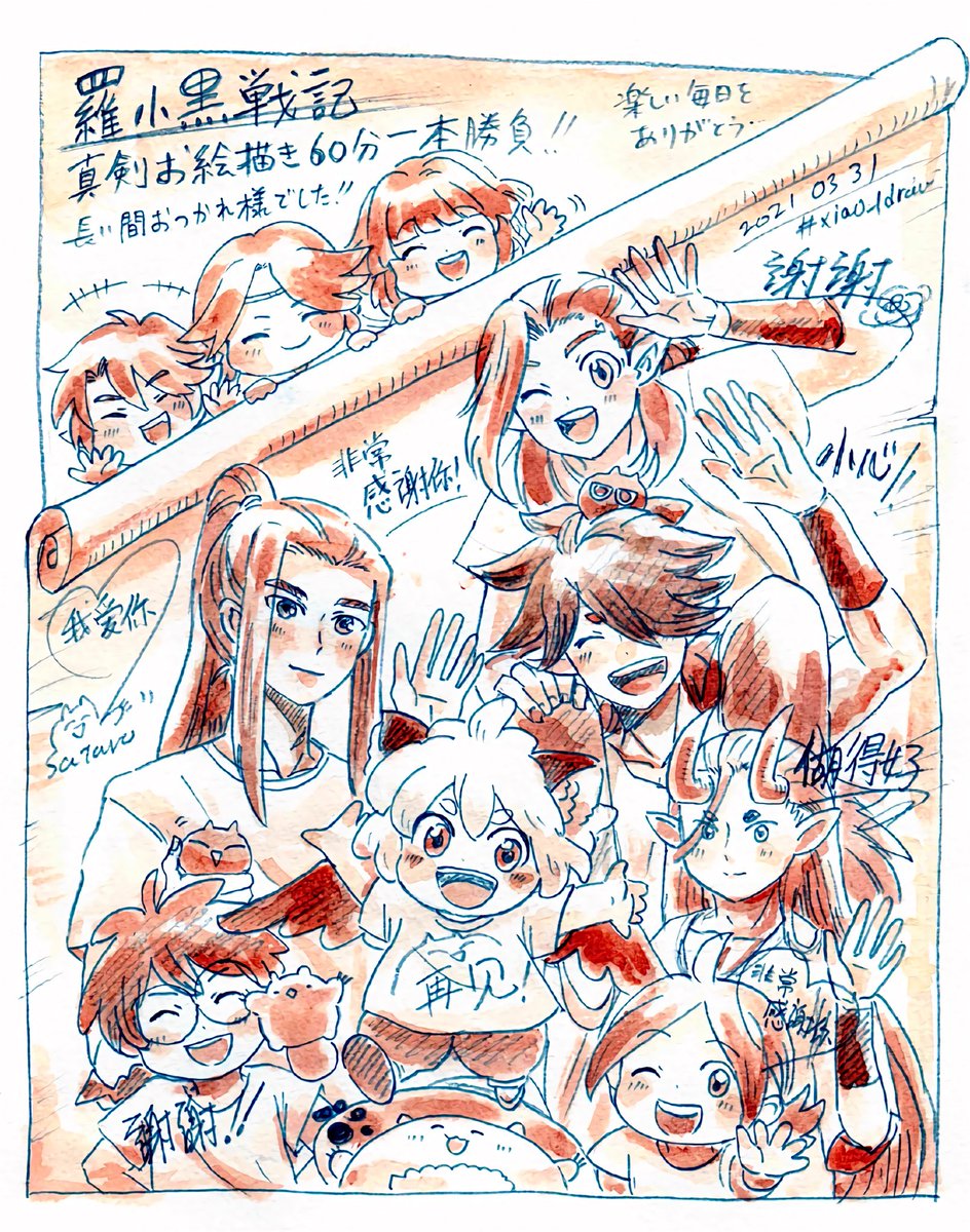20 117 #xiao_1draw +15min +文字 運営様、素敵な時間をありがとうございました。 寝る前のワクワクする時間が楽しみでした。 最後なのでキャスト寄せ書き風に感謝を。 21/03/31 23:01