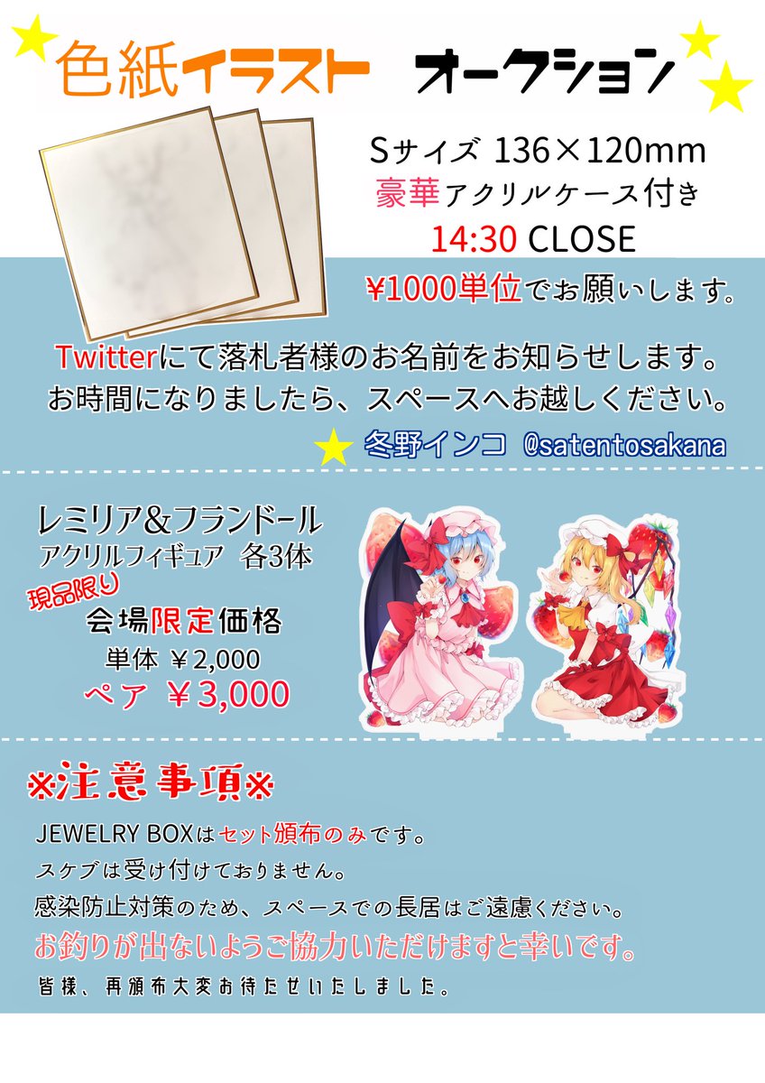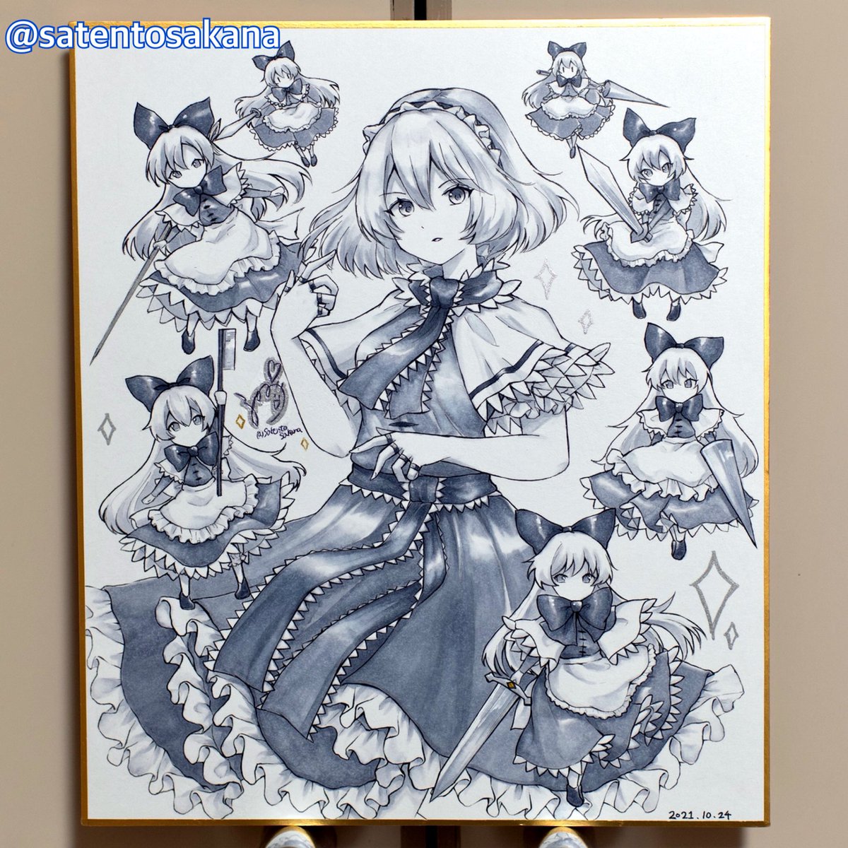 秋例大祭お疲れ様でした! 次回の春例大祭は参加予定です。 今夜21時にBoothにて アリスの色紙イラスト頒布いたします✨ 今回かなりの描き込みで自信作になります。 よろしくお願いします🙏 satentosakana.booth.pm