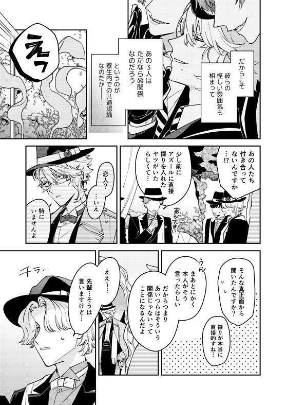 腰を抱き寄せられたからそういう流れかと思ったのに延々撫でまわして眺めてくるだけで全然先に進まないジェに痺れを切らしたアズとそっちからこられると思ってなくてびっくりジェの🎃ジェイアズ (最後にちょっとフロくんもいる)