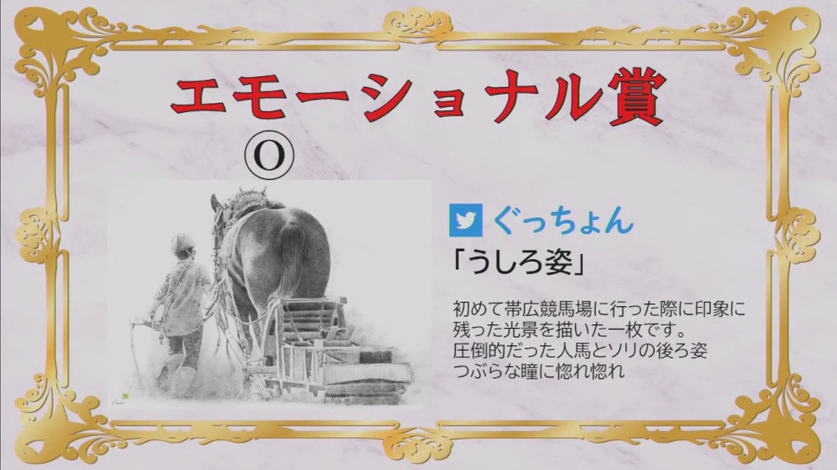 22 163 第1回ばんえいお絵かきコンクール エモーショナル賞をいただきました! 嬉しすぎてまだふわふわしています。 23/02/18 19:38