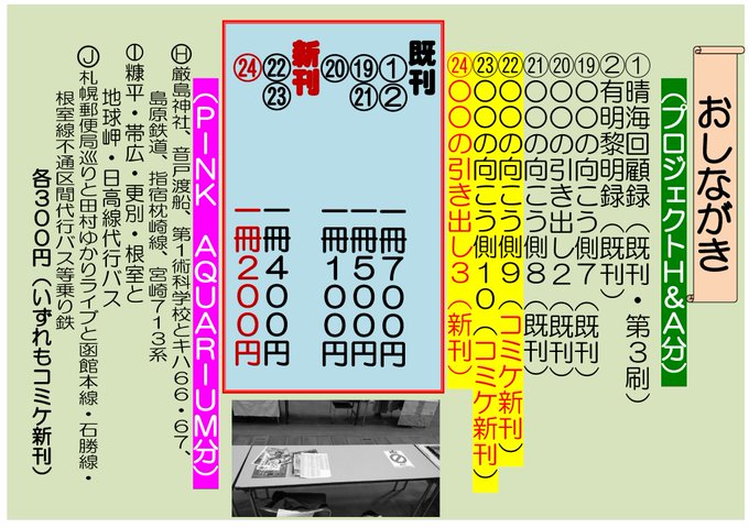C99AC99A12/31(金)東1ホールK02b「プロジェクトH&A」お品書きになります。 当日頒布するのはこちらになりますが、他既刊の見本も持参しておりますので、お申し付けくださればお見せできます。 他既刊のお求めはBOOTHにて(なお全新刊既刊こちらでお求めできます)。 satohmomo777.booth.pm #C99A