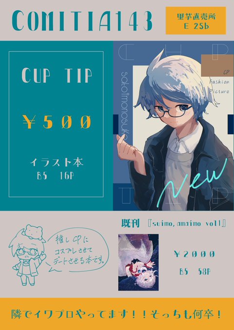 6 9 2月19日(日)のCOMITIA143,おしながきです! 2枚目は新刊サンプルです!! スペース【E25b】です!! 間に合えば色紙も描きたい……です!!!むりかも!!! よろしくお願いします!! スケブも描きます!!! 23/02/13 21:24