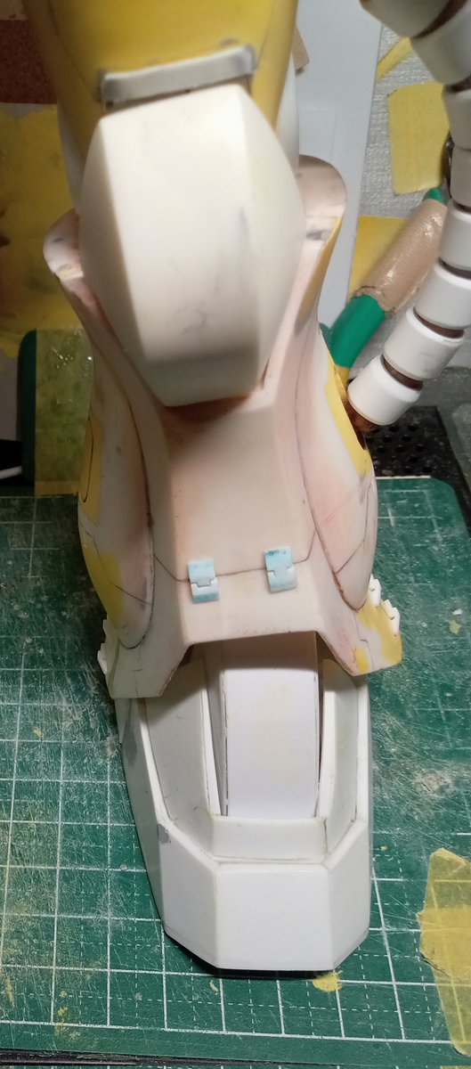 #ガンプラ ども❗進捗です 今回はお手付きしたままで放置してたたのでバックパックにジャンクパーツで後部センサーとラジエーターみたいに見えなくもないかと思って半身にしたパーツをポン付けしました💡 流体パルスの冷却をする物だとして、上の小窓が尚の事いらない子に成るのはどうした物か🤔