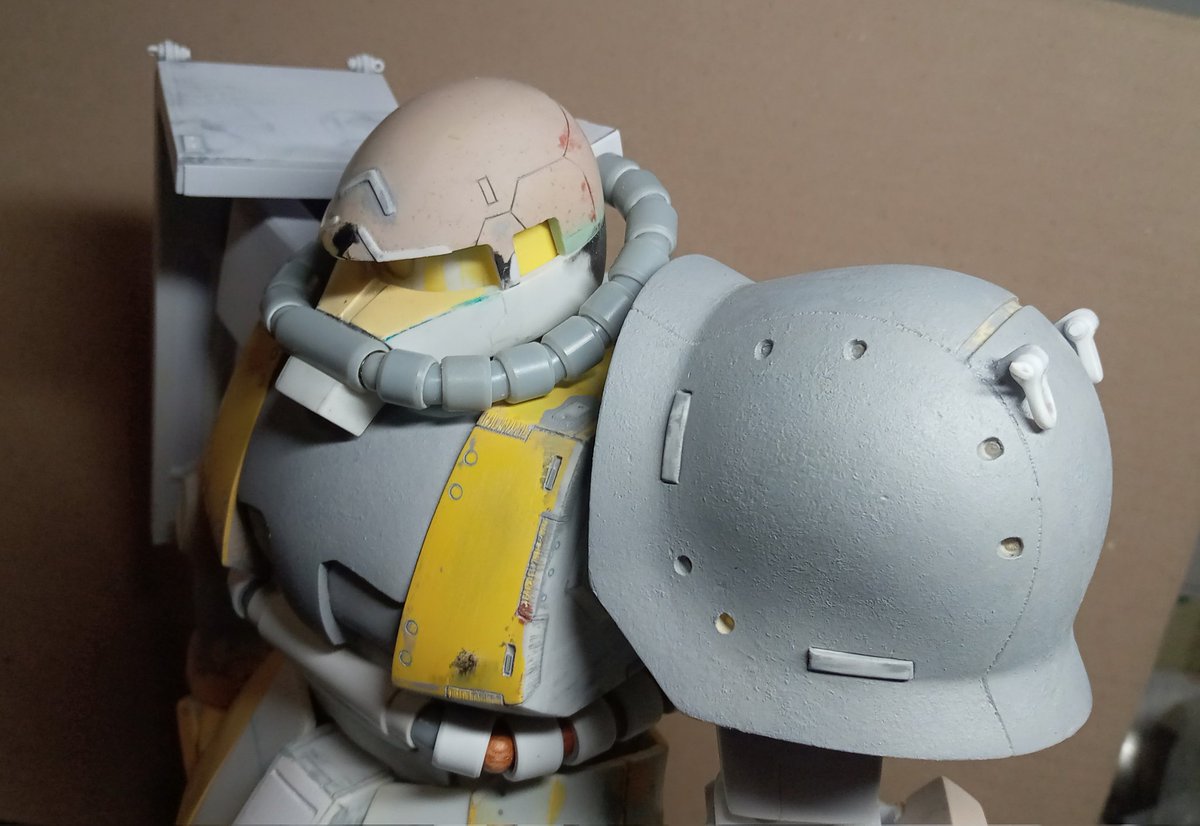 #ガンプラ おはざいます❗早起きすぎて暇なので報告です💡 今回はより兵器感出るかなと思ってモノアイをアニメ感+防御面のありそうなHGタイプに変更。胸部は厚みがあって頑丈そうなザクMGver1に寄せて厚みをマシマシにしてみました💡