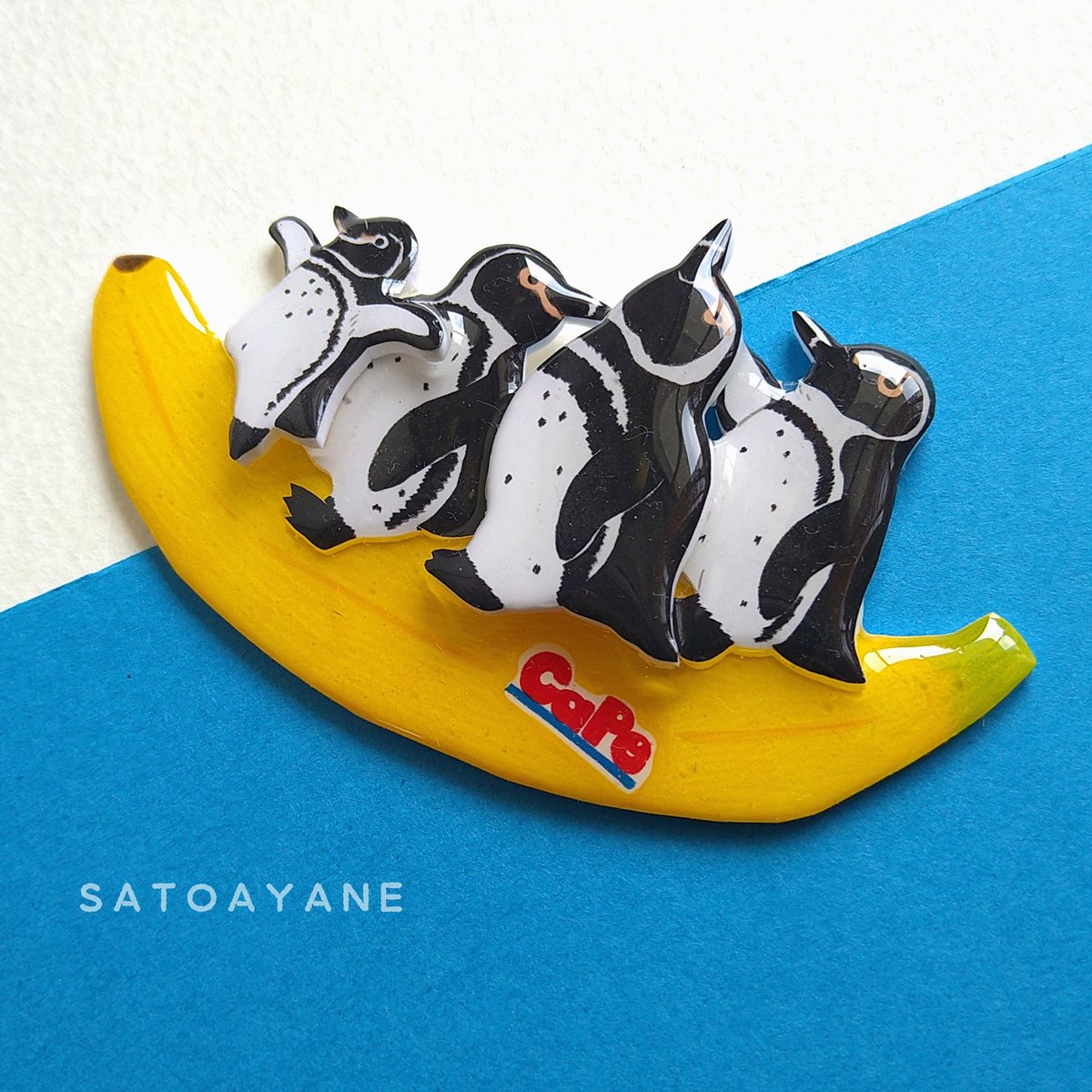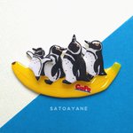 新作🍌バナナボートペンギンブローチ ケープ属勢ぞろいでバナナボート楽しんでます どの子が誰かわかるかな? #いきもにあ2022 で初お披露目です〜🐧