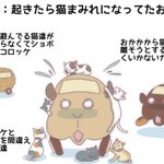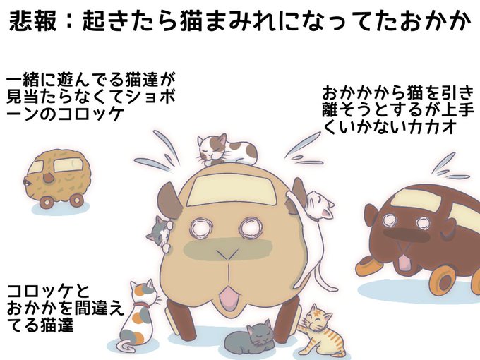 #モルカー #モルカーファンアート 昨日のモルカーパーキングのツイ見て思いついたネタ 猫にコロッケと間違えられたおかかちゃん(猫達の中ではコロッケはモルカーで唯一遊んでくれる友達) おかか「%$@#!!」 カカオ「おかか今助ける!(でも怖い)」 コロッケ「猫達いないなぁ…」