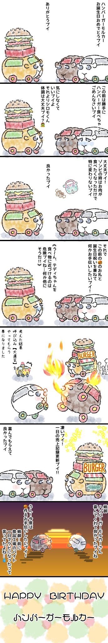 #PUIPUIBIRTHDAY #モルカーファンアート ハンバーガーモルカーさんお誕生日おめでとう🍔 ハンバーガー勝手に食べられても怒らないどころか、その場を収めようとした聖人ならぬ聖プイの貴方に幸あれ