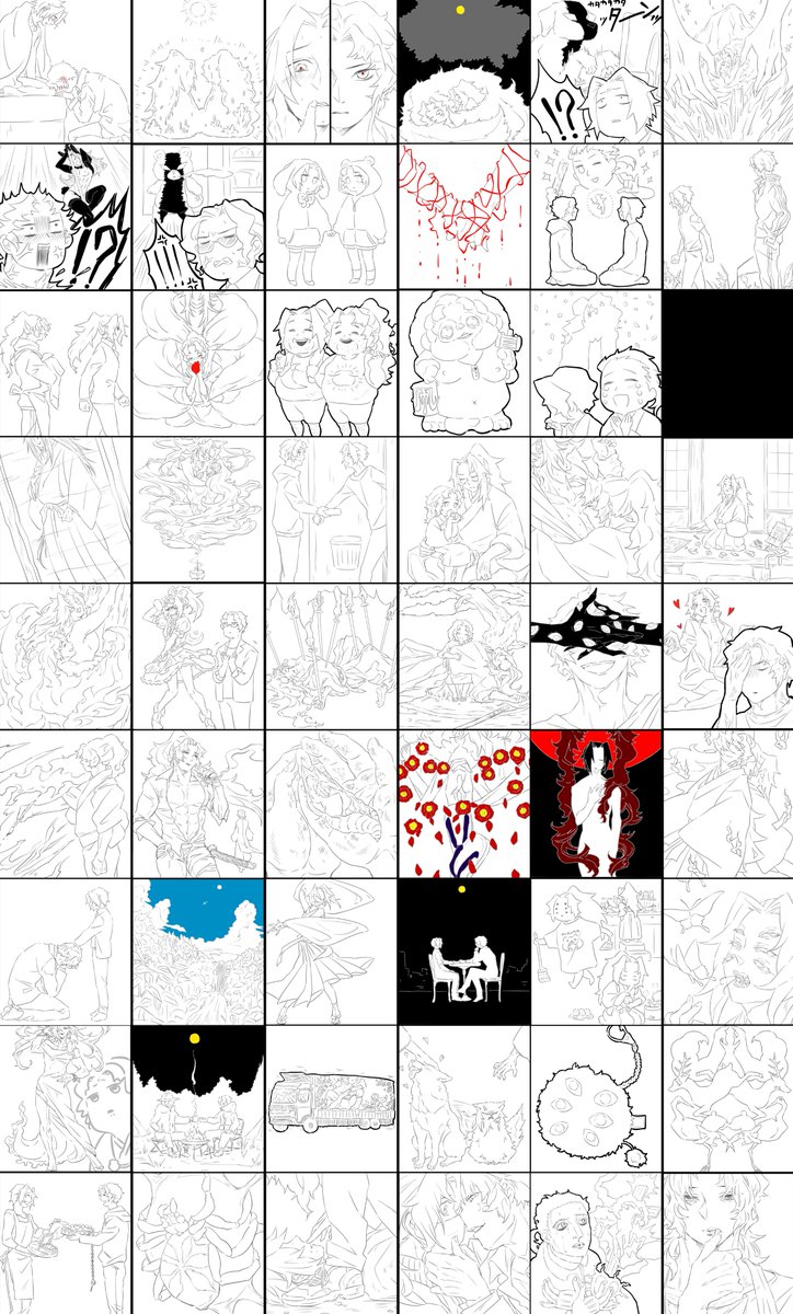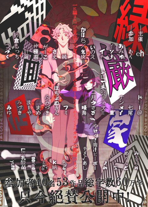 #縁巌覆面作家企画3ファンアート こう、並べてみて、作品の豊かさとその作品を生み出す作家様方とそれらが文字通り一堂に会する覆面企画まじでやばすぎるな(語彙力)と真顔になってしまいました(真顔) 今はこれが精いっぱい🏳️ですが、色塗れた暁にはもう1枚絵足してトランプとか作りたいですね!♠️