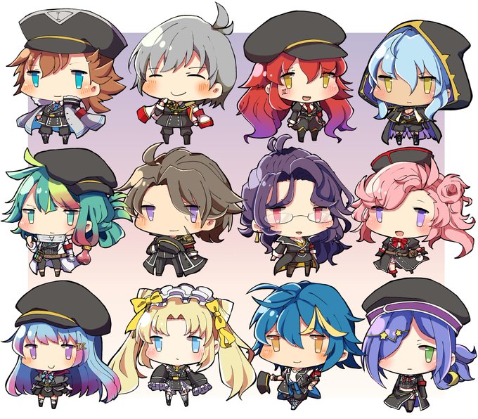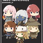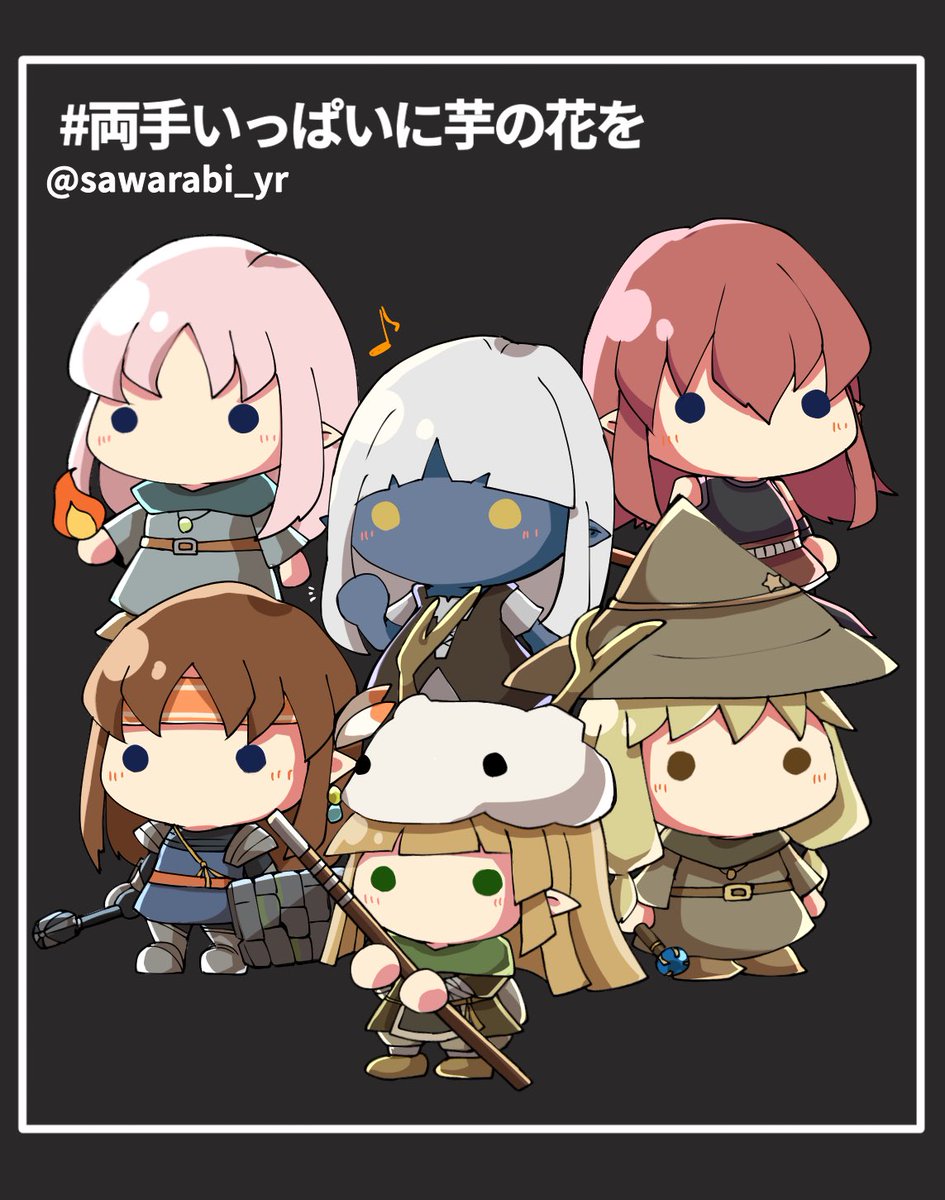 芋花自宅っ子&チーフちゃん描いた! 1周目通常プレイの3人(手前)と、2周目少人数旅の2人(奥)! #両手いっぱいに芋の花を