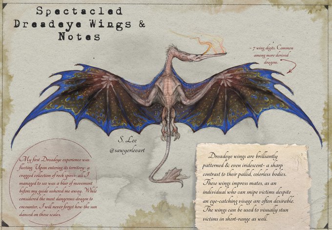 The wings of the Spectacled Dreadeye dazzle viewers with their charm- and burden this stealthy sniper with a handicap to stealth. Despite this, they manage to remain perhaps the most dangerous dragon humans have ever encountered.