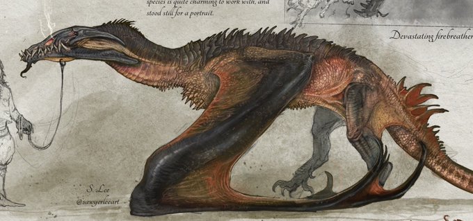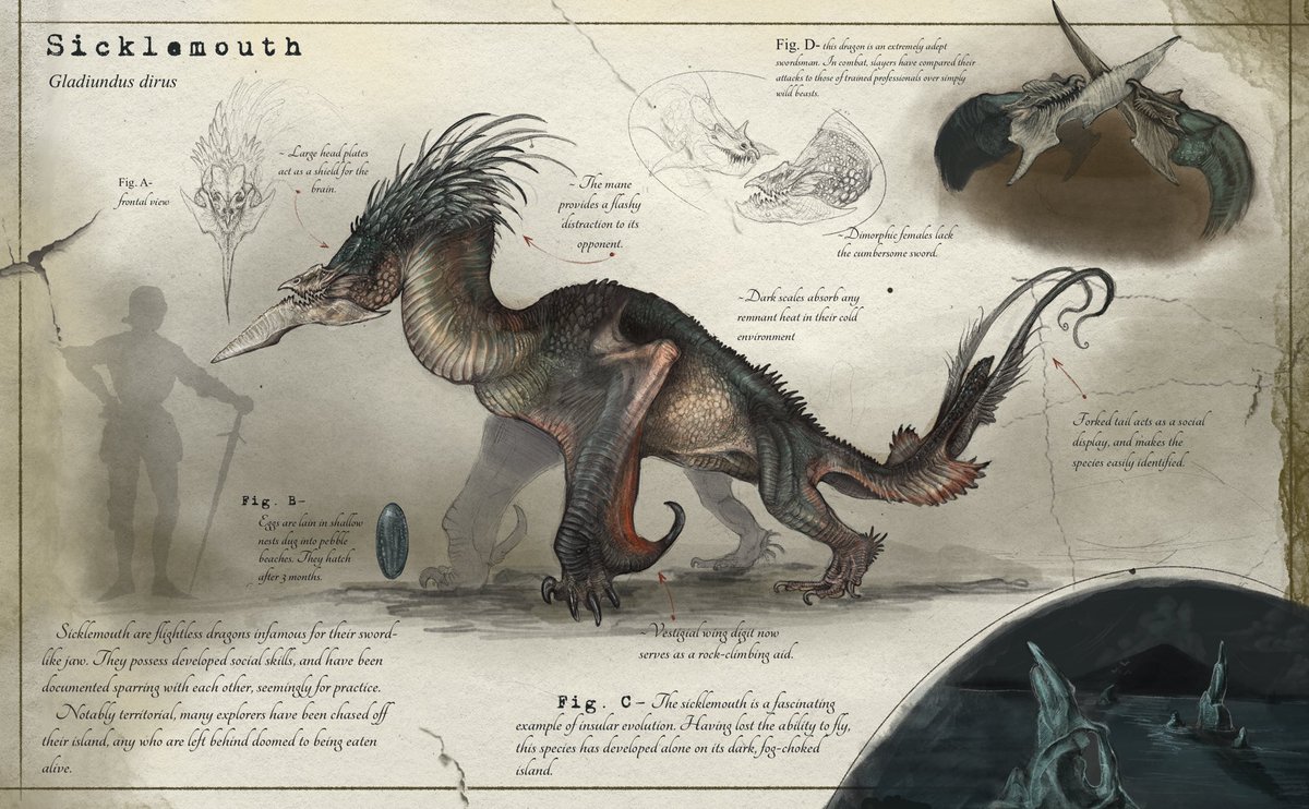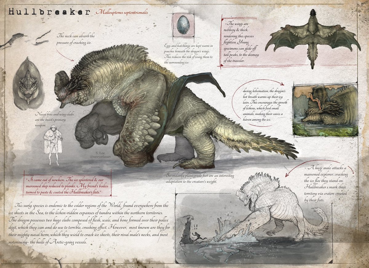 Redo: the Hullbreaker. A colossal arctic dragon known to punish explorers with its heavily calloused wing-clubs, which have the power to shatter ice floes. Hullbreakers are perhaps the only dragon known to take on a Kinsbane & win, thus ensuring the North is free of the tyrants.