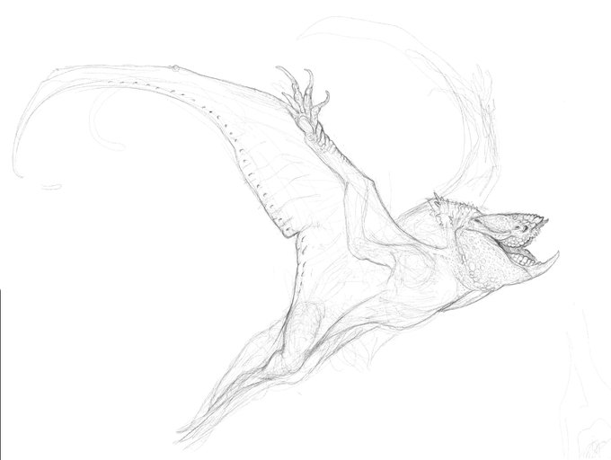Quick sketch of a flying Clatterjaw. For a page detailing their wing membrane musculature (in short they can shrink when grounded and expand surface area in the air)