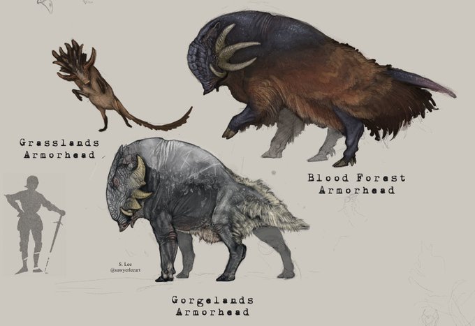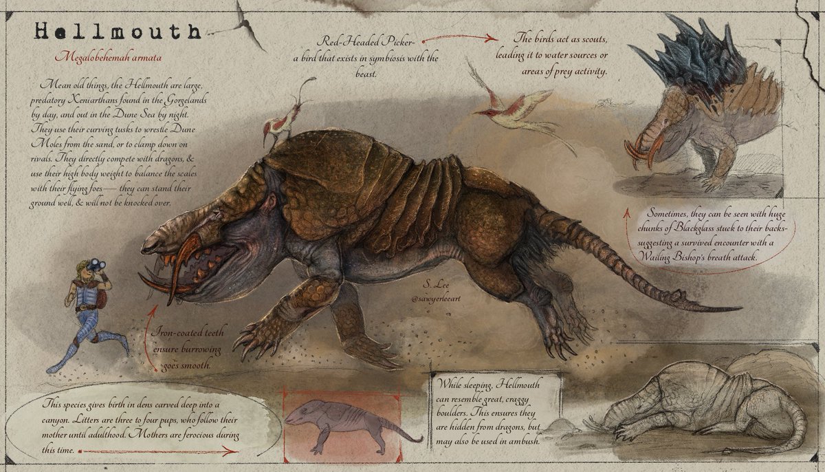 Hellmouth are a rare case of a giant mammalian predator in this world, & defend their status fiercely. Resilient to a fault, the hellmouth can endure endless hardship with ease. Slayer Aodh is known for using one to pull his dreadful Meat Cart- sharing in the culinary bounty.