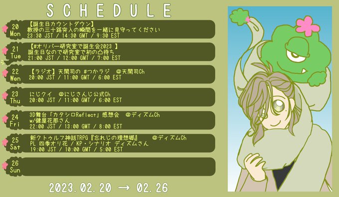 7 9 あまりにも今週のスケジュールが盛りだくさんだったので、つい出来心でENのライバーさんっぽいスケジュール作ってみた! (日曜のみ不明だったので空白。追加があれば更新予定) #絵バンス #エバンスレポート提出 23/02/22 03:35