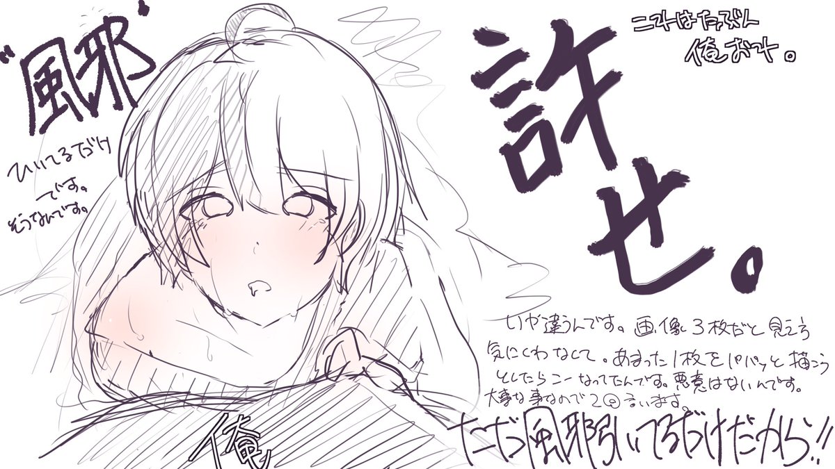 3 22 これは新居の配信でASMR系配信者にチェンジせざるおえなかったときの為のサムネイラストです。 ご納めください。 4枚目は見え方的に3枚で投稿したくなかったのでついでに描いた“風邪っぴき”のkamitoさんなんです。 なにがとは言わないけど許せ。 #かみ絵いむ 22/01/07 19:05