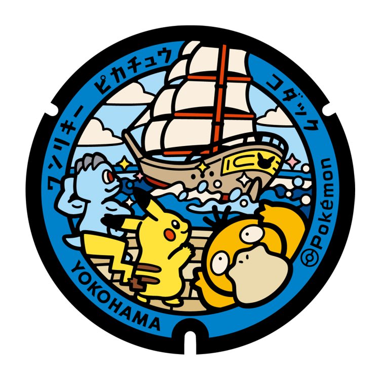 【おしらせ】ポケモンマンホール「#ポケふた」、ヨコハマ YOKOHAMAに新しく設置される、ピカチュウとワンリキーとコダックのマンホールを作画しました⭐8月7日までに、日本丸メモリアルパークに設置予定です。どうぞよろしくお願いいたします⛴️✨ local.pokemon.jp/manhole/