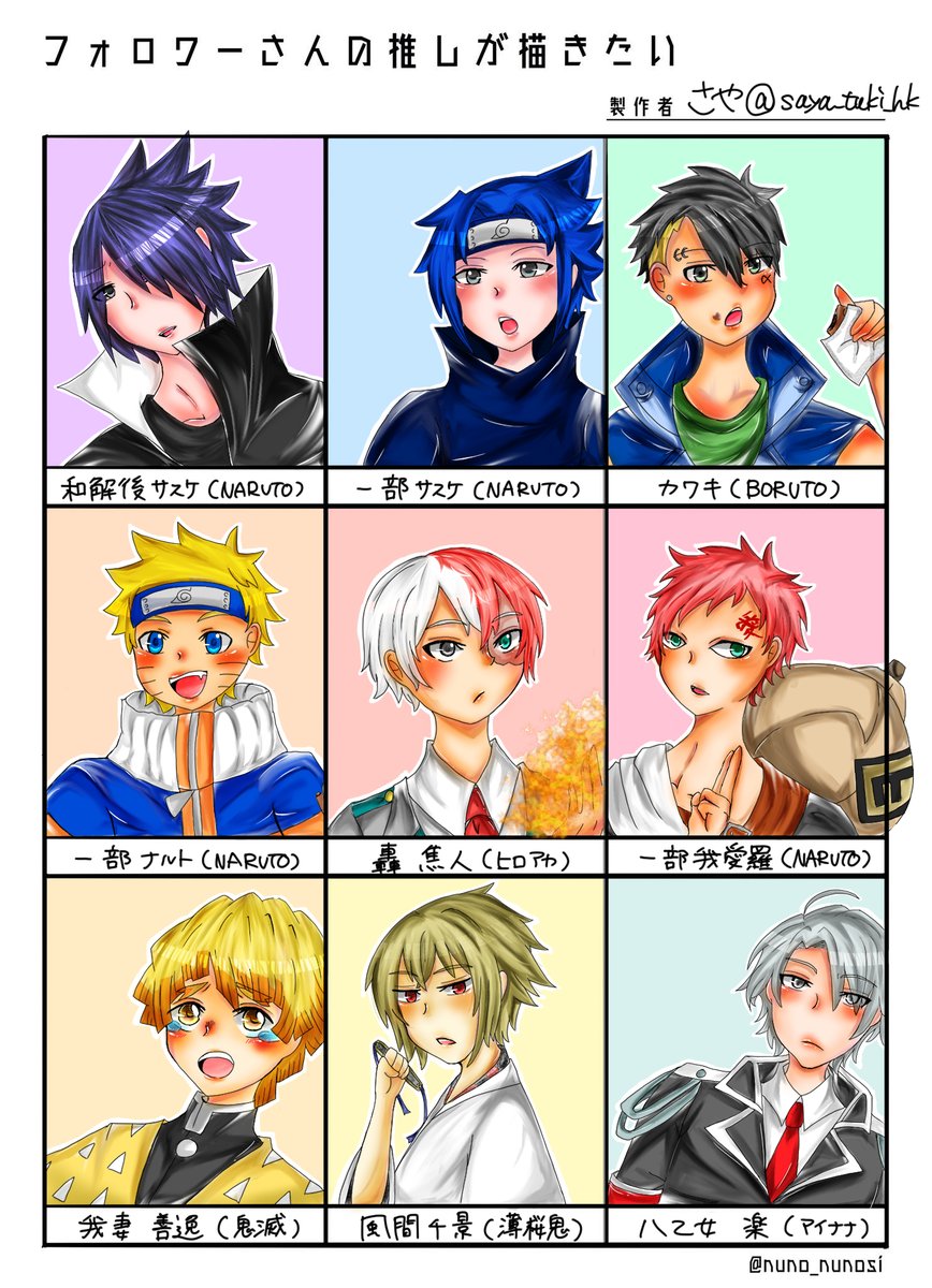 お待たせしました~!! リクエスト本当にありがとうございました😊 とても楽しく描かせて頂きました!!✨ けいとさん りゅうたんさん ミナトさん 飛鷹みんさん 未来さん サカガミ逸平さん ちまにゃんさん あんばーさん みかんさん #フォロワーさんの推しが描きたい