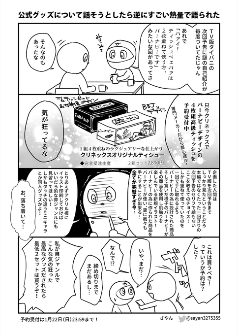 クリネックスさんのタイバニコラボティッシュ、家族に買おうかな~って話そうとしたら予想外の反応だった。 私の絵は適当なので商品はこちらでご覧ください… twitter.com/kleenex_JP_/st… #さやんの実録漫画