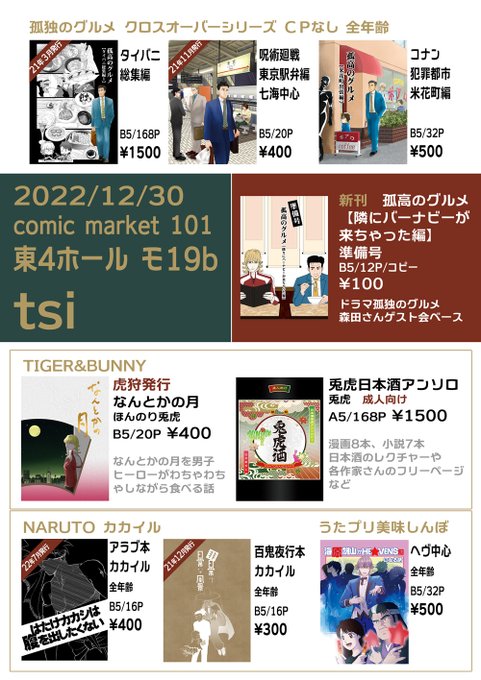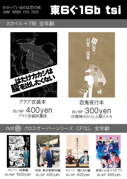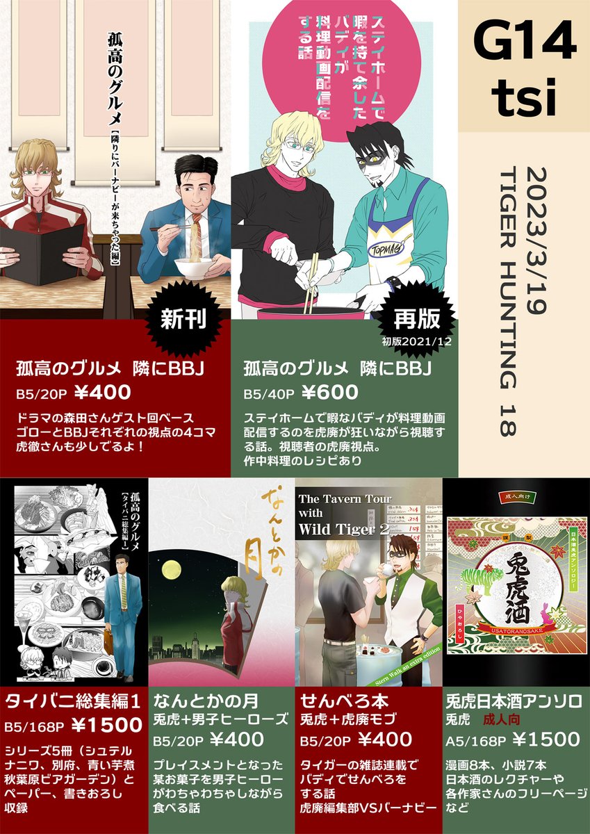 虎狩18 tsiお品書きです 開始当初は狩りにでてるのでクローズしてます。すみません。 ころてつさん本を全部…全部狩りつくさないと... 新刊は多めに刷ってます。 コロナ中止後の初コミケの時の新刊は部数が読めなくいつもより減らしたらすぐ完売したので今回再版しました。 pixiv.net/artworks/10632…