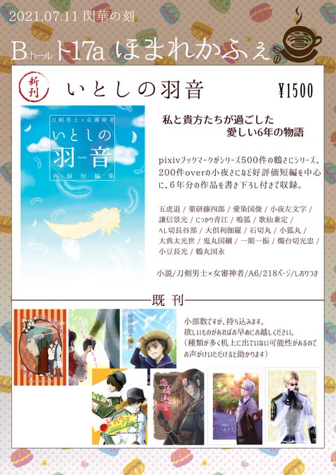 【お品書き】閃華の刻 火華2021 11/28 #お品書き #刀剣乱舞 #女審神者 #刀さに #COMICCITYSPARK16 #閃華の刻火華2021 #一門擾乱 #ちょもさに #ちょぎさに pixiv.net/artworks/94263…