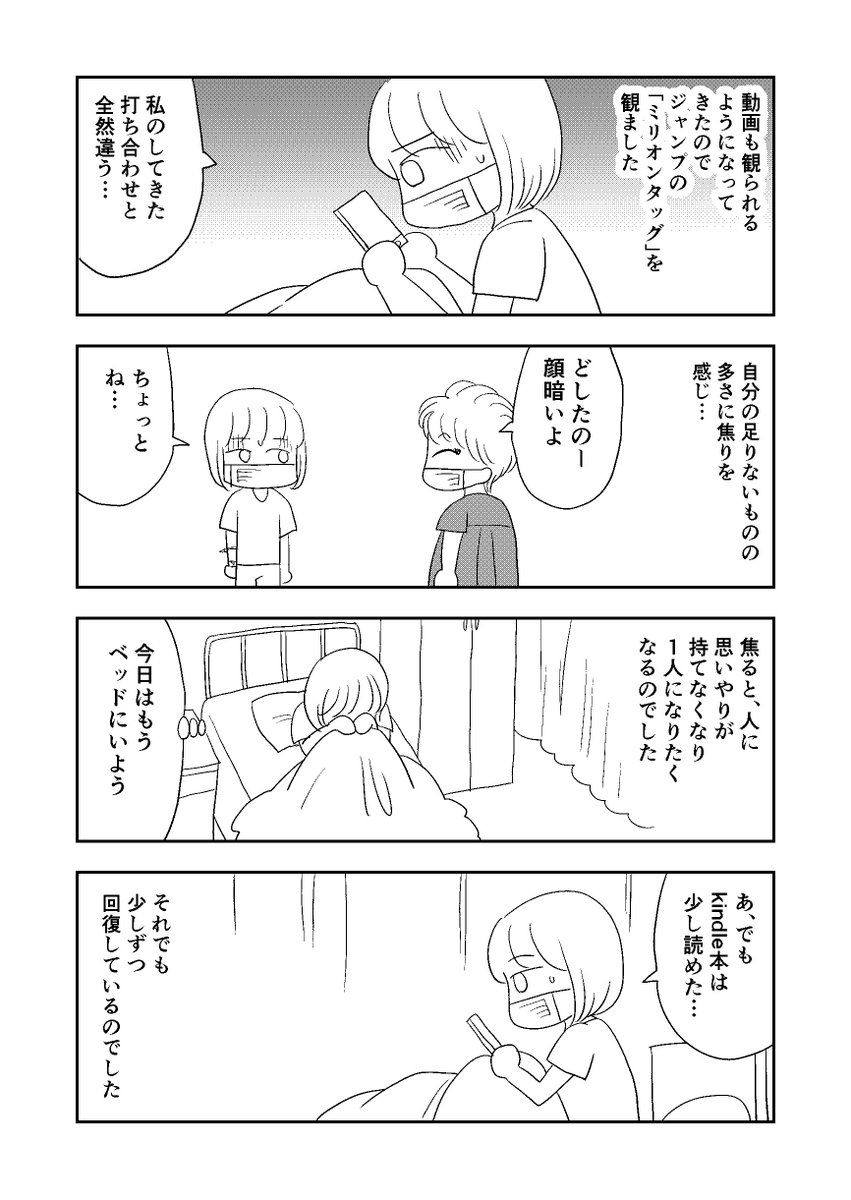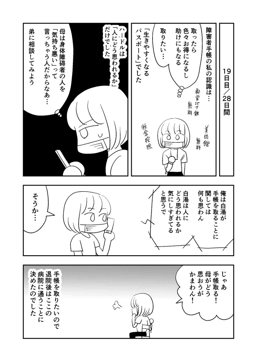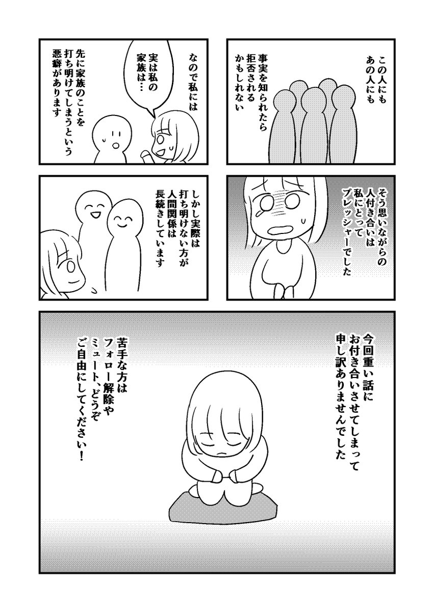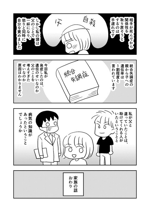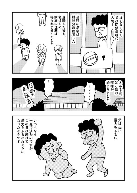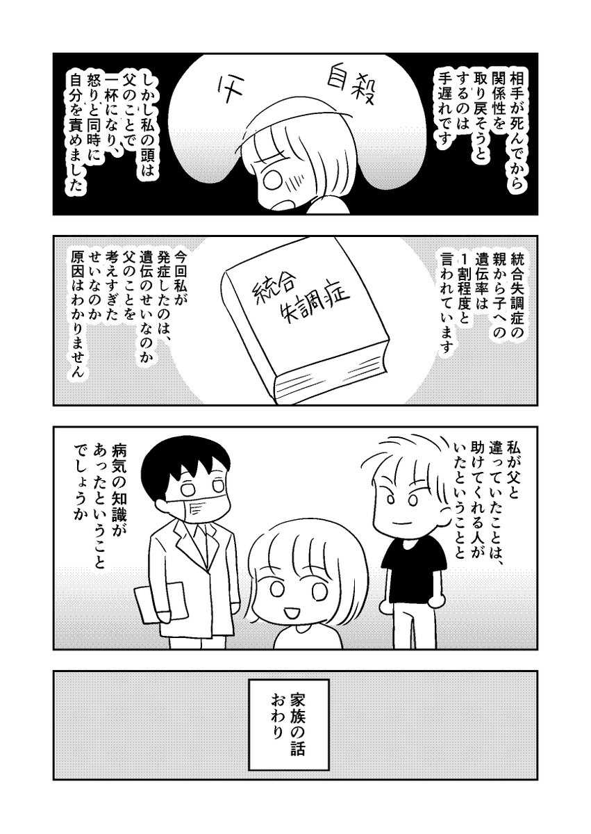 7 81 一昨年、統合失調症で入院した日記をエッセイ漫画にしました。第4話(4/4)※重い話です。注意! #統合失調症 #エッセイ漫画 #漫画が読めるハッシュタグ 23/01/29 10:13