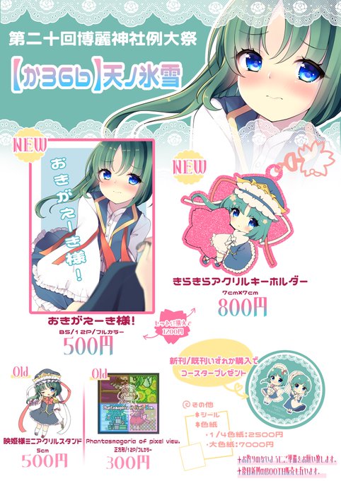 2023年5月7日に開催される第二十回博麗神社例大祭のお品書きです! 映姫様お着替え本の新刊を中心にグッズや色紙等、映姫様もりもりでお届けします。 【か36b】天ノ氷雪にてお待ちしております。当日は宜しくお願い致します! #例大祭20