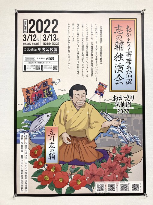 #おかえり寄席気仙沼 のポスター届きました!開催は3/12(土)3/13(日)。チケット販売は1/5から。 描かせていただいたイラストには気仙沼市の花ツツジと、市の魚カツオ。気仙沼つばき会にちなんで椿の花。さんま寄席で来てくださった志の輔師匠への「おかえりなさい」の気持ちでサンマをいれました。