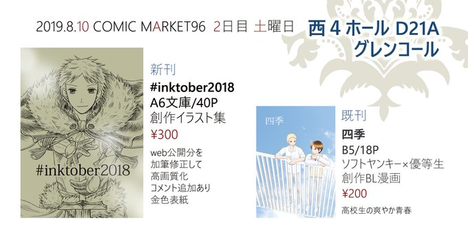夏コミおしながき。新刊はインクトーバー画集、既刊は青春創作BL漫画です。よろしくお願いします webカタログ webcatalog-free.circle.ms/Circle/14530662 #C96おしながき #inktober #inktober2018 #C96WebCatalog